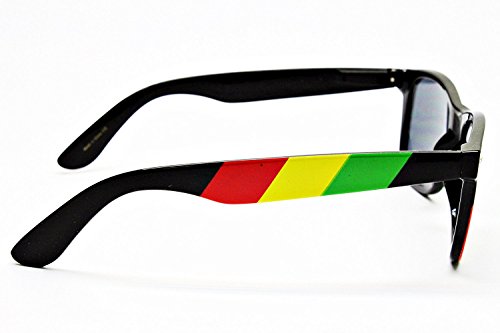 Rasta Stripes Square Sunglasses. Frame design features a Jamaican themed pattern with green, yellow & red stripes on the arms and front of the frame. Smoke black color lenses on a lightweight plastic frame.