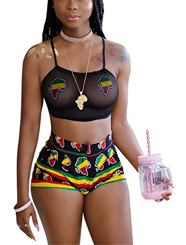 Women’s Sexy 2pcs Outfits Strap See Through Crop Top Shirts + Pants Club Shorts
